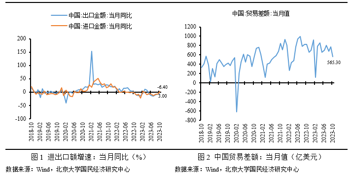 2023年10月份,按美元计价,中国进出口总值4931.3亿美元,同比下降2.5%。其中,出口2748.3亿美元,同比下降6.4%;进口2183.0亿美元,同比增长3.0%;贸易顺差565.3亿美元。总体来看,10月份出口增速略有下滑,几乎与前月持平;进口增速有负转正,进口增速显著上涨。