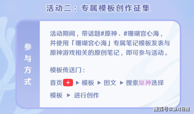 玩家还可以参与“专属模板创作征集”活动,在这个活动中玩家只要带原神、心海的话题,并使用“珊瑚宫心海”专属笔记模板发表于原神游戏相关的原创内容,即可参与活动。该活动可获得的奖励与“原创笔记征集”活动相同。