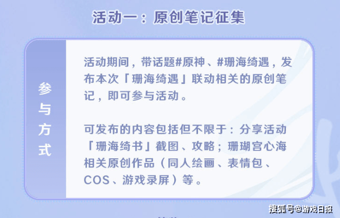 除了主题活动外,在小红书中,各位原神玩家还可参与“原创笔记征集”活动,在这个活动中,只要玩家发布本次“珊海绮遇”相关的截图、攻略以及其他相关二创,就有机会获得官方送出的联动限定周边1套以及原石。在这个活动中,一等奖玩家可以获得3000原石、二等奖可获得1000原石、三等奖为500原石,幸运奖为心海专属流沙立牌。