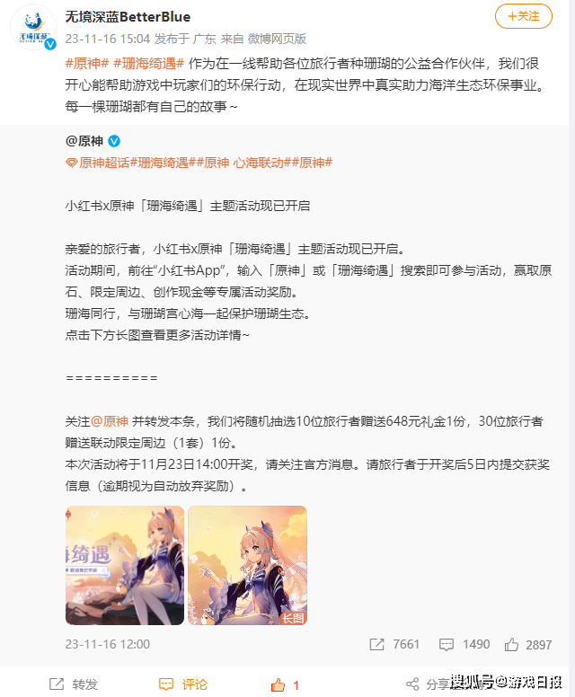 原神宣布了将与小红书一起开展公益联动活动,在这次联动中,珊瑚宫心海将作为联动代言人登陆小红书。玩家可以前往小红书中与心海一起保护珊瑚生态。只要玩家在小红书中搜索“原神”并参与“珊海绮遇”公益主题活动,积累生长值,即可解锁原石、经验书、摩拉币等游戏道具奖励。