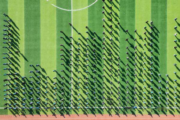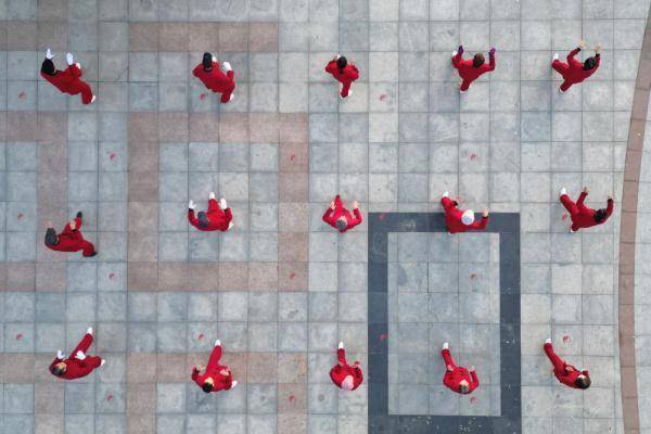 ↑11月16日,邢台市柏乡县职教中心学生在练习八段锦(无人机照片)。王光耀 摄