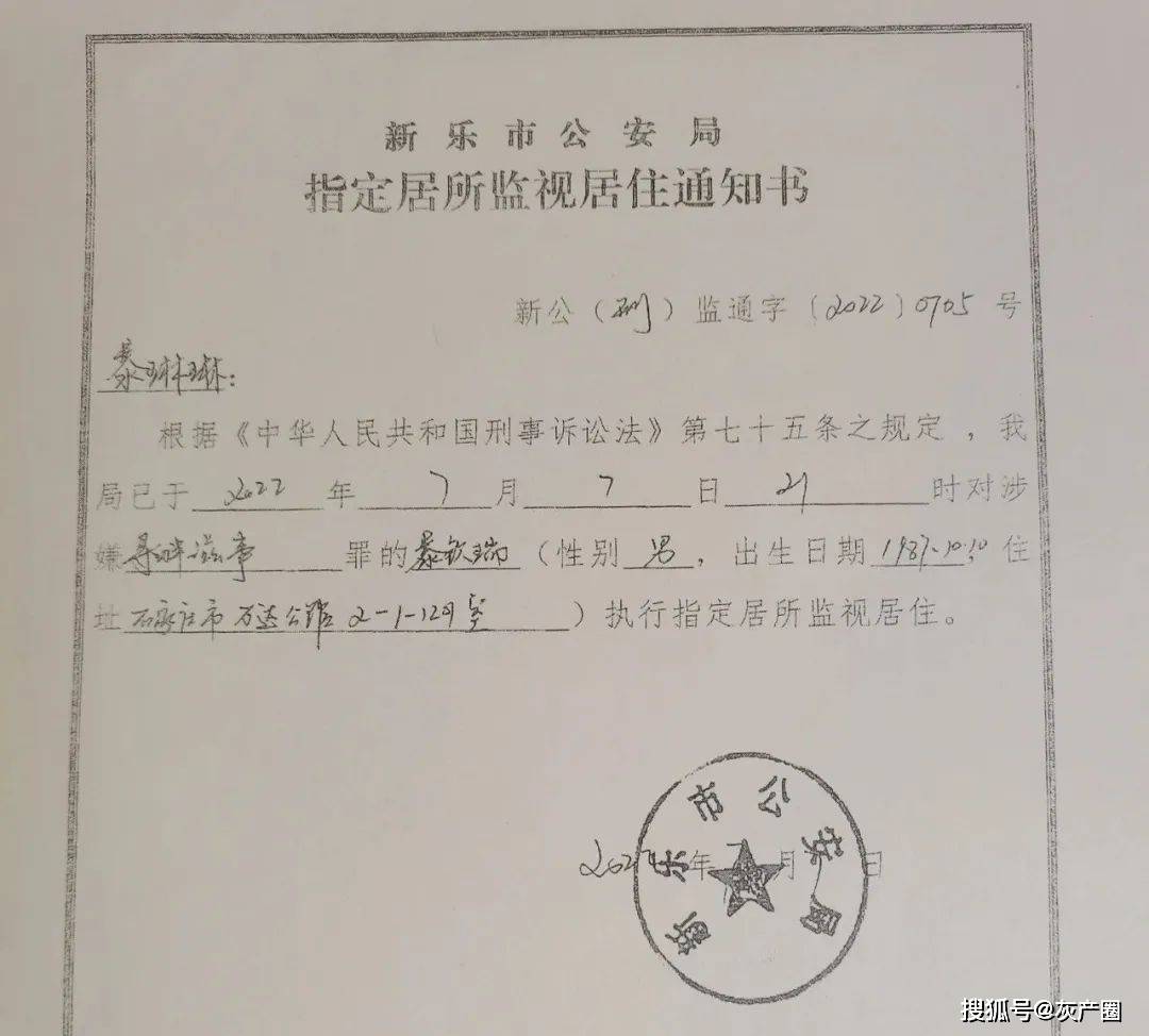 暴钦瑞是石家庄市高邑县住建局的工作人员,7月7日凌晨,他在石家庄市裕华区的家中被公安人员带走,家属后来收到的新乐市公安局执行指定居所监视居住通知书显示,事由为“涉嫌寻衅滋事”。同一天被带走的,还有他的父亲暴继业、哥哥暴韶瑞、二叔暴记忠及其儿子暴卓瑞、三叔暴纪涛,以及同村的暴晓龙、暴士峰、暴彦强。