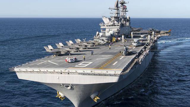 “美利坚”号名为两栖攻击舰,但搭载F-35B垂直起降战斗机后,已经是一艘不折不扣的轻型航母了,可以说主力尽出。