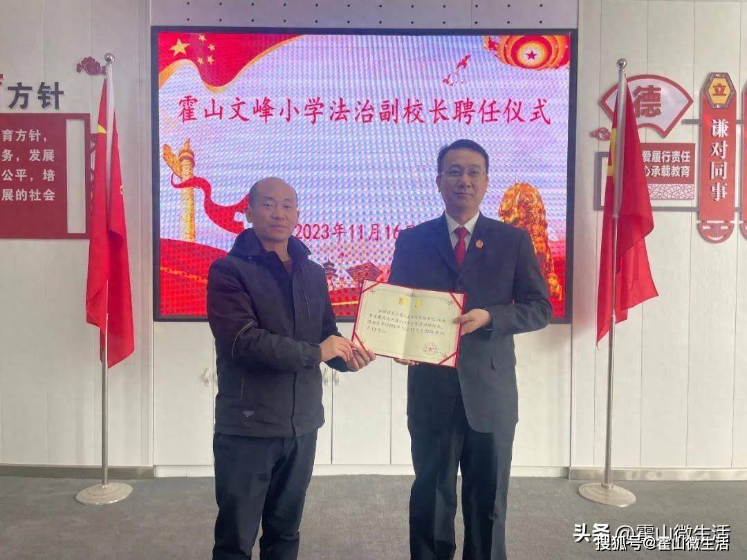 为增强青少年的遵纪守法意识和自我保护能力,给未成年人撑起法律之伞,从源头预防和减少未成年人违法犯罪发生,护航青少年健康成长,11月16日,霍山文峰小学聘任霍山县人民法院党组书记、院长李义发为霍山文峰小学法治副校长。聘任仪式上,李义发院长从文峰小学德育主任汪晶磊手中接过聘书,正式成为霍山文峰小学法治副校长。
