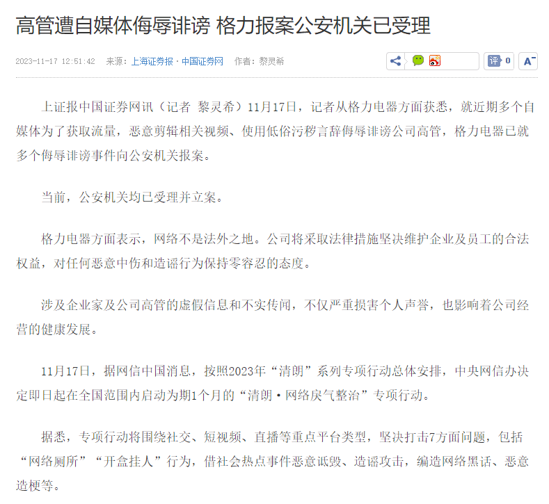 11月17日,记者从格力电器方面获悉,就近期多个自媒体为了获取流量,恶意剪辑相关视频、使用低俗污秽言辞侮辱诽谤公司高管,格力电器已就多个侮辱诽谤事件向公安机关报案。