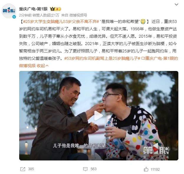 为了更好照顾儿子,易和平带着25岁的儿子一起跑网约车,用独特的父爱温暖着孩子。