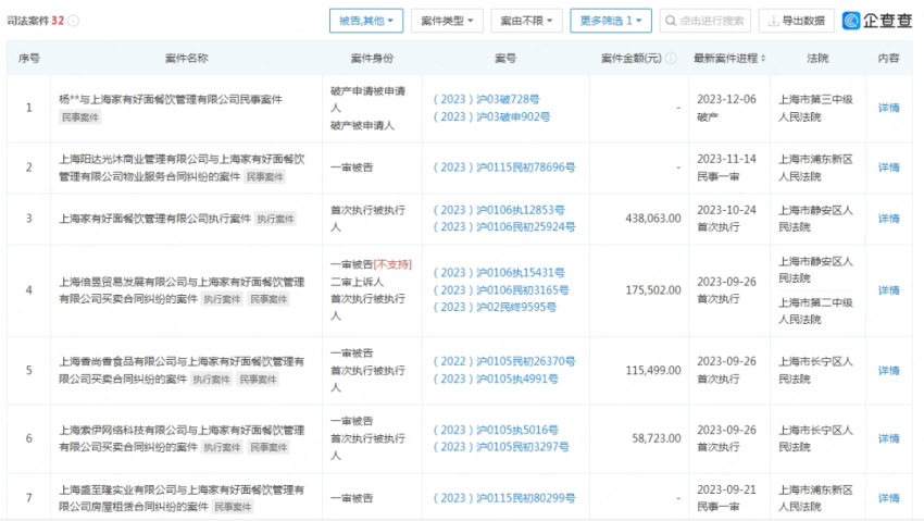 企查查信息显示,今年以来,家有好面公司作为被告共涉及32起案件,案件的主要案由是劳动合同纠纷和买卖合同纠纷,涉案金额约194万余元。该公司作为失信被执行人的案件金额也超百万元。