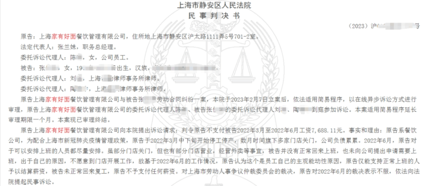 其中一份判决书显示,原告上海家有好面餐饮管理有限公司向法院提出了“不支付被告2022年3月至2022年6月工资7688.11元”的诉讼请求,理由之一是:为配合上海市新冠肺炎疫情管理政策,原告于2022年3月中下旬开始停工停产,数月时间旗下多家门店关门,公司负债累累。