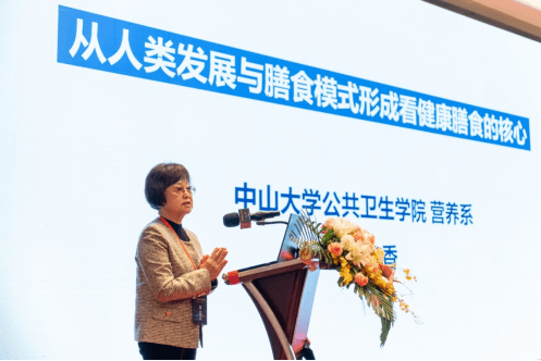 在学术研讨会环节,与会专家就“聚势创新,共营健康”主题进行了分享和讨论。中山大学公共卫生学院营养系博导苏宜香就会议主题率先“破题”,她从人类发展与食物演变为切入点,对现代营养学的发展与人体健康的关联进行深入浅出的分析,最终总结出健康膳食的核心是食物多样不过量。