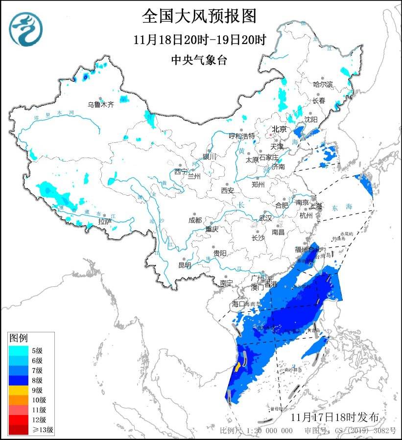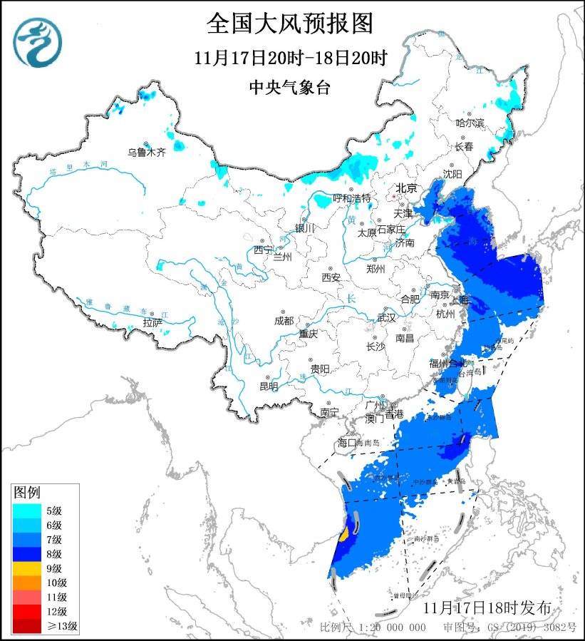 预计,11月17日20时至18日20时,渤海、渤海海峡、黄海大部海域、东海大部海域、台湾海峡、台湾以东洋面、巴士海峡、南海大部海域将有7~8级、阵风9~10级的大风;内蒙古中东部、东北地区东部、山东半岛东部等地将有5~6级、阵风7~8级的大风。