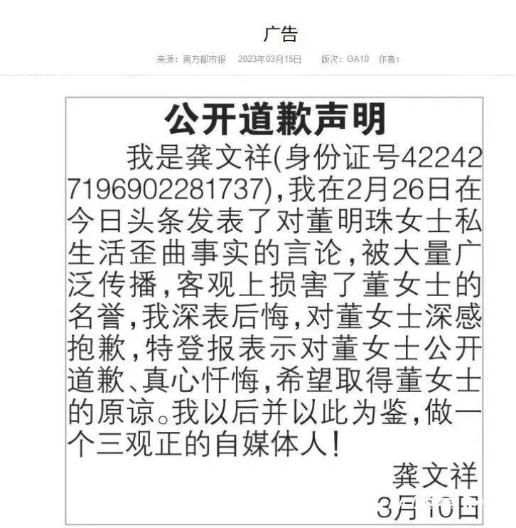 而在今年3月时,大V龚文祥在南方都市报就此前的言论登报向格力电器董事长兼总裁董明珠道歉。龚文祥在道歉声明中称,他于2月26日在今日头条发表了对董明珠女士私生活歪曲事实的言论,被大量广泛传播,客观上损害了董女士的名誉。“我深表后悔,对董女士深感抱歉,特登报表示对董女士公开道歉、真心忏悔,希望取得董女士的原谅。我以后并以此为鉴,做一个三观正的自媒体人。”龚文祥在声明中说。