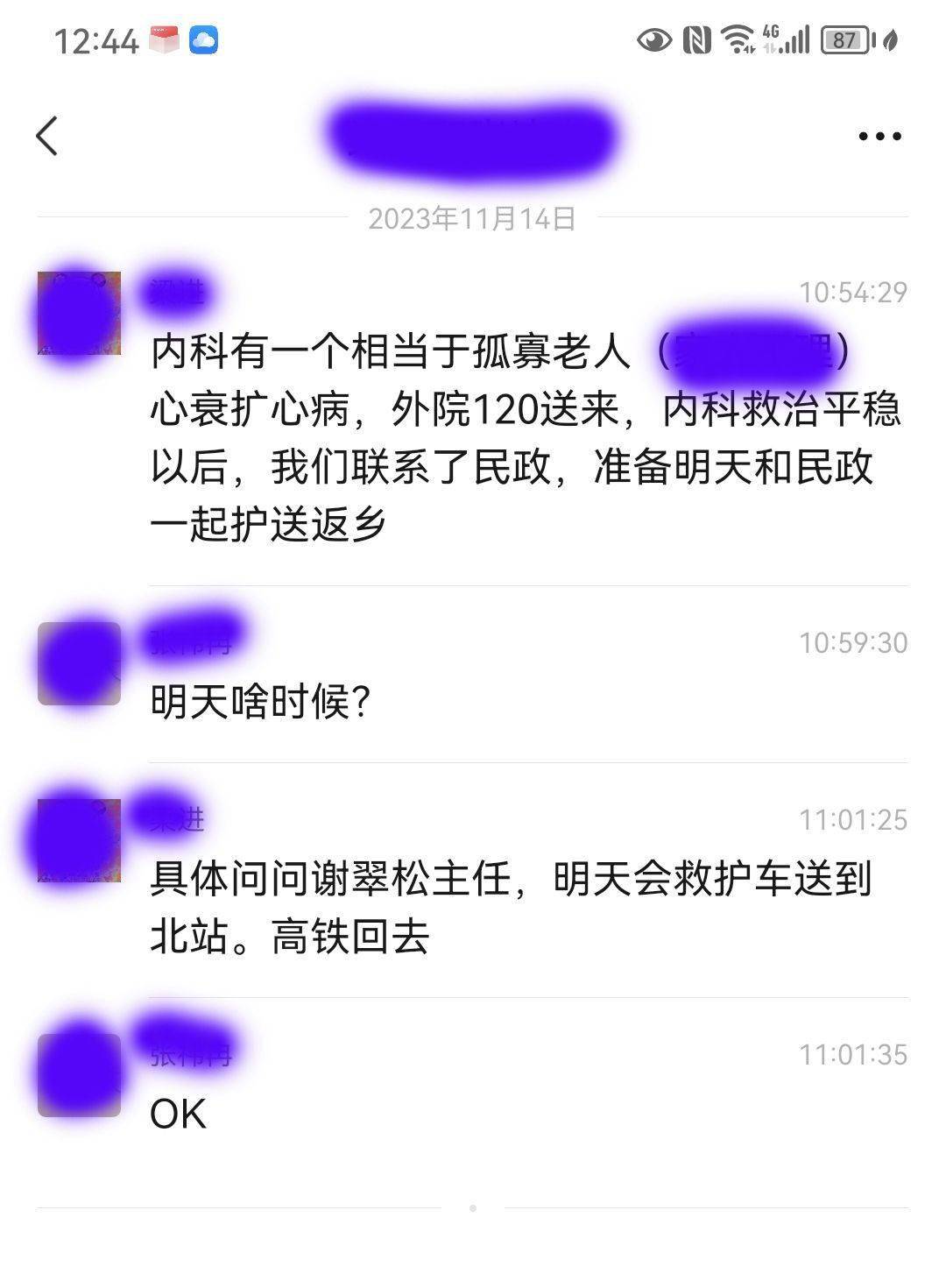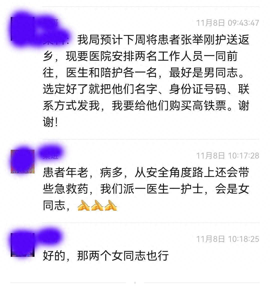 经过医院慎重考虑决定派遣两名专业的医生护士,并和坪山民政局的2名工作人员一起用救护车送老人去高铁站,然后又全程护送至湖北荆门,并与当地民政部门做好了对接。