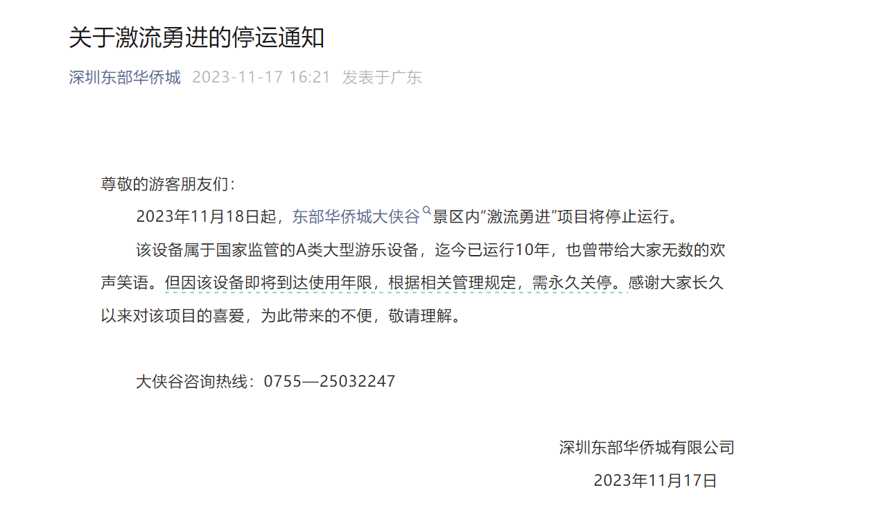 据“深圳东部华桥城”官方微信公众号消息,2023年11月18日起,东部华侨城大侠谷景区内“激流勇进”项目将停止运行。