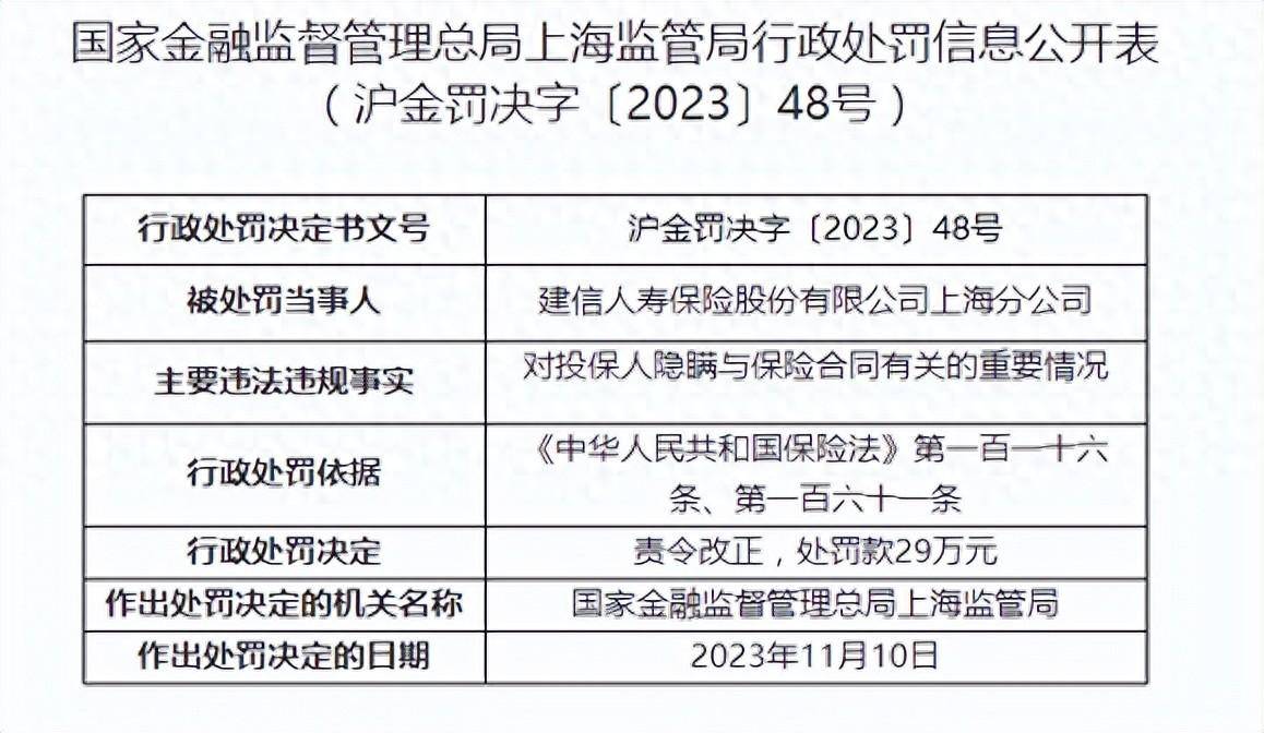 11月17日,据国家金融监督管理总局上海监管局公布的行政处罚信息,因对投保人隐瞒与保险合同有关的重要情况,建信人寿保险股份有限公司上海分公司(下称建信人寿保险上海分公司)责令整改,并罚款29万元。