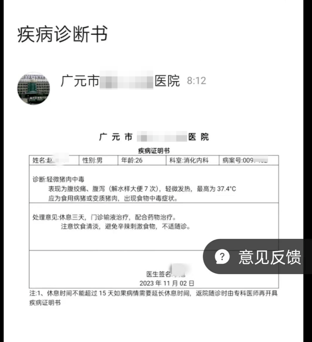 原本以为事情就这样过去了,然而4日上午,赵某某联系上王先生称,原本3日下午公司让他出差,但自己身体不舒服拖了一晚,早上醒来还是“虚得不行”,又去复查了一下,还是没有完全好。同时,赵某某称,“这肉到底出了啥问题啊,昨天打完点滴感觉没啥事,中午就把药断了,现在只好又请假。”