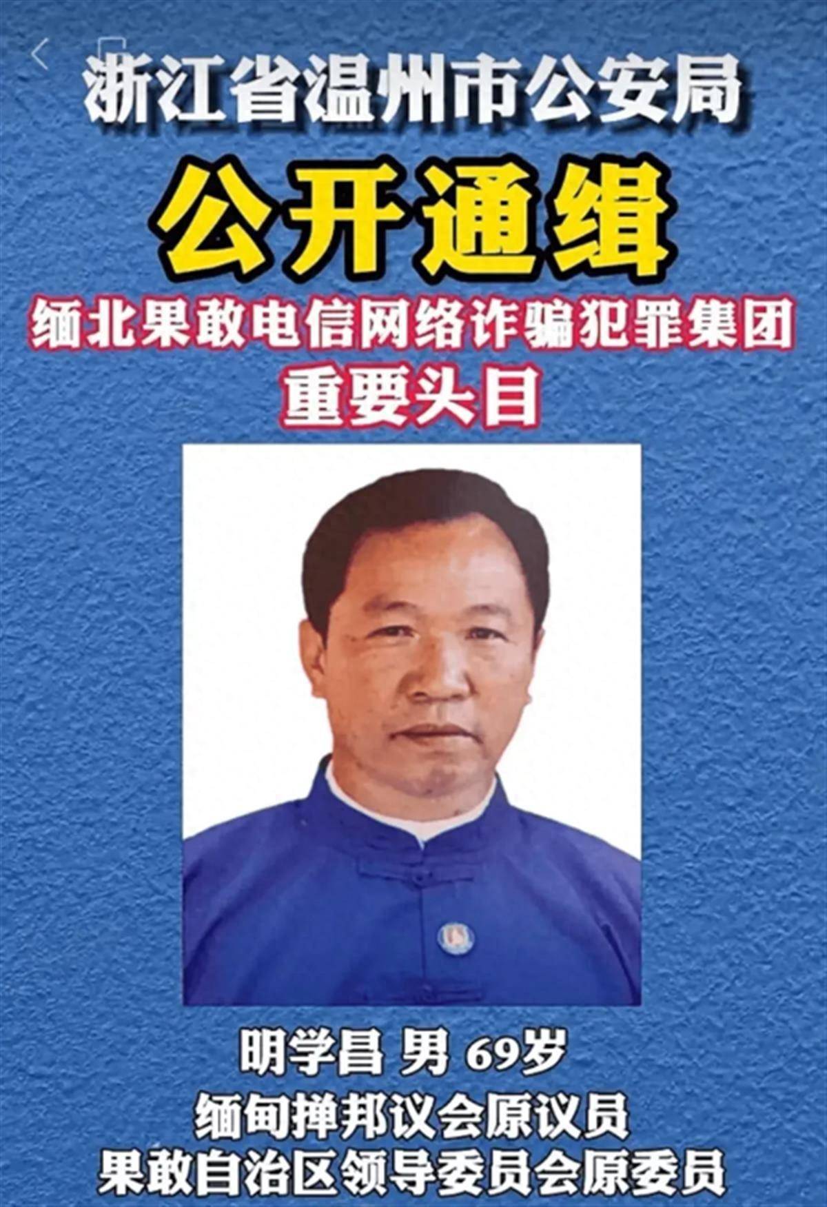 此前,公安机关侦查发现,以明学昌为首的犯罪集团长期组织开设诈骗犯罪窝点,公开武装护诈,实施针对中国公民的电信网络诈骗犯罪活动,诈骗数额巨大,在公安机关严打高压态势下,仍不收敛、不收手,继续大肆组织实施违法犯罪活动,并涉嫌故意杀人、故意伤害、非法拘禁等严重暴力犯罪,情节极其恶劣、危害极其严重。在充分掌握相关犯罪事实和证据基础上,11月12日,浙江温州公安机关决定对明学昌、明国平、明菊兰、明珍珍4人公开悬赏10至50万元通缉。