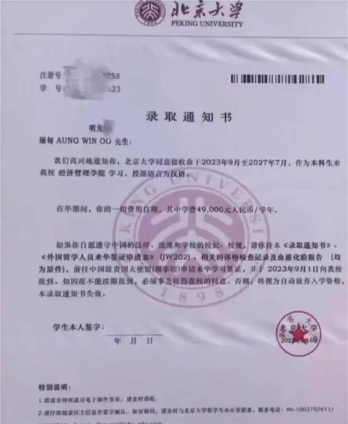 网传明光忠的录取通知书(网络图)