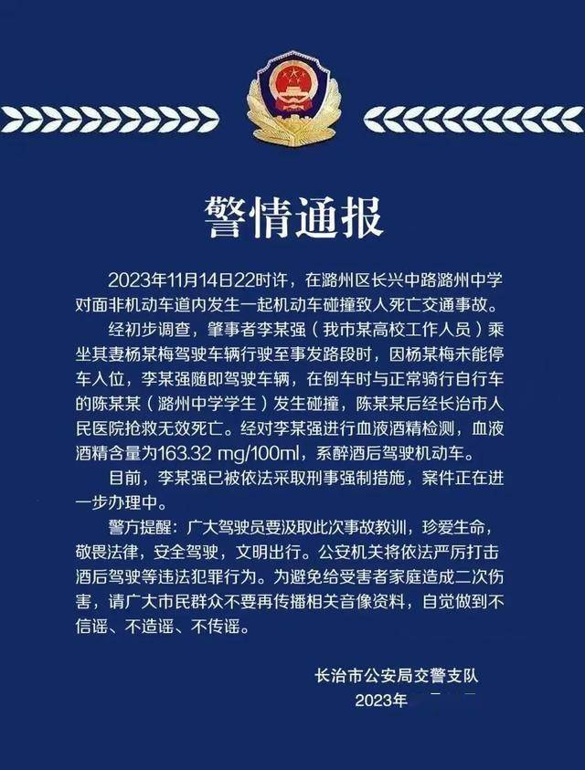 经初步调查,肇事者李某强(我市某高校工作人员)乘坐其妻杨某梅驾驶车辆行驶至事发路段时,因杨某梅未能停车入位,李某强随即驾驶车辆,在倒车时与正常骑行自行车的陈某某(潞州中学学生)发生碰撞,陈某某后经长治市人民医院抢救无效死亡。经对李某强进行血液酒精检测,血液酒精含量为163.32 mg/100ml,系醉酒后驾驶机动车。