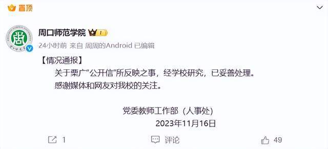 随着此事的关注度越来越高,周口师范学院也关注到了此事,并及时通过官方微博发布情况通报,表示目前该事已经妥善处理。