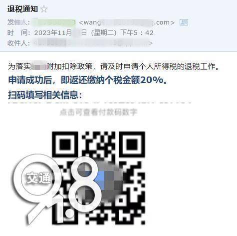 小佳(化名)在杭州某公司做白领,上周末,在公司内部邮箱中看到一则“退税”通知。小佳回忆说:“一个wangqh**发来的邮件,写着‘为落实好专项附加扣除政策,请及时申请个人所得税的退税工作。申请成功后,即返还缴纳个税金额20%。’邮件里还附带个二维码,我也没多想,就扫码操作了。”