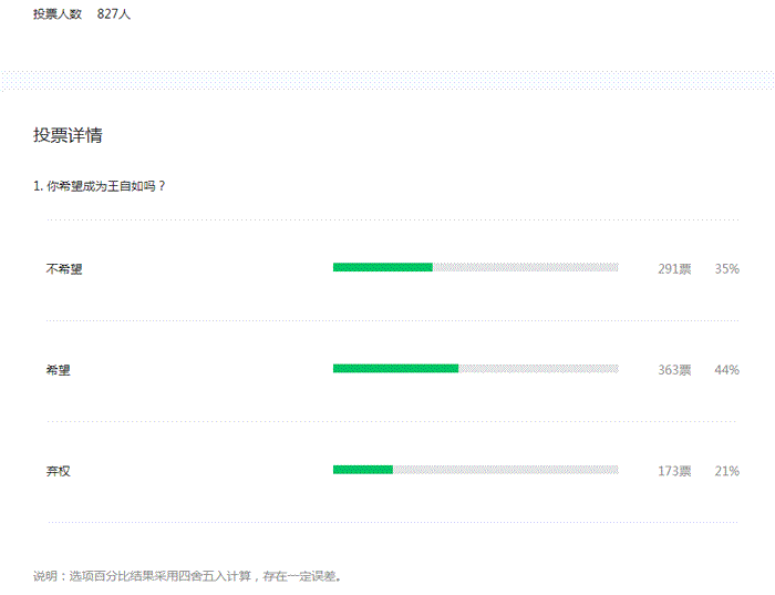 有44%的人希望成为王自如,有35%不希望,有21%弃权!