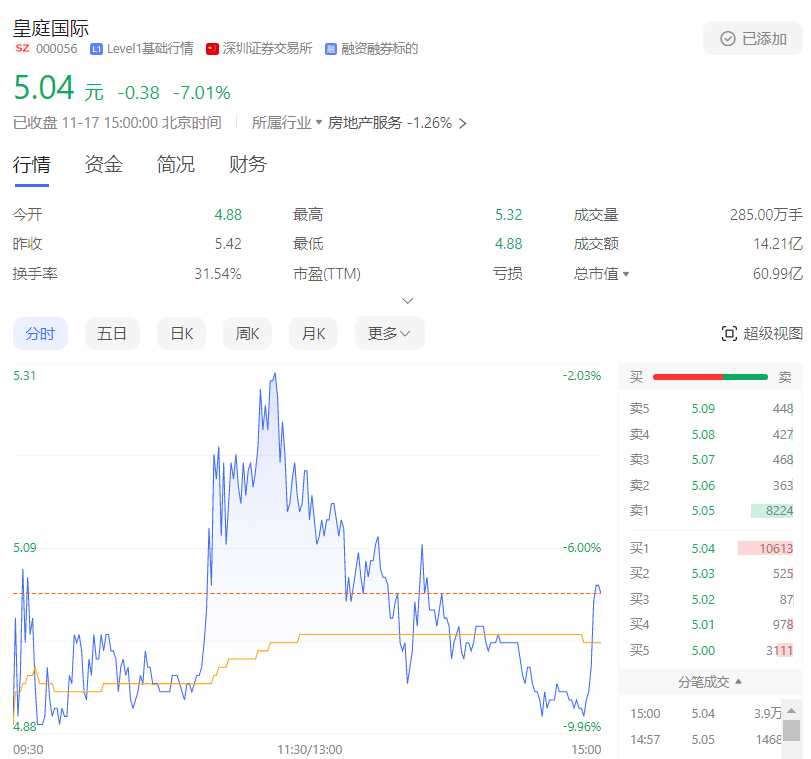 在股市上,今天的皇庭国际再次延续了昨天的势态,股价继续下跌,开盘就报价4.88元/股,而后盘中再次打开,截止到收盘,皇庭国际的股价为5.04 元,下跌幅度7.01%。