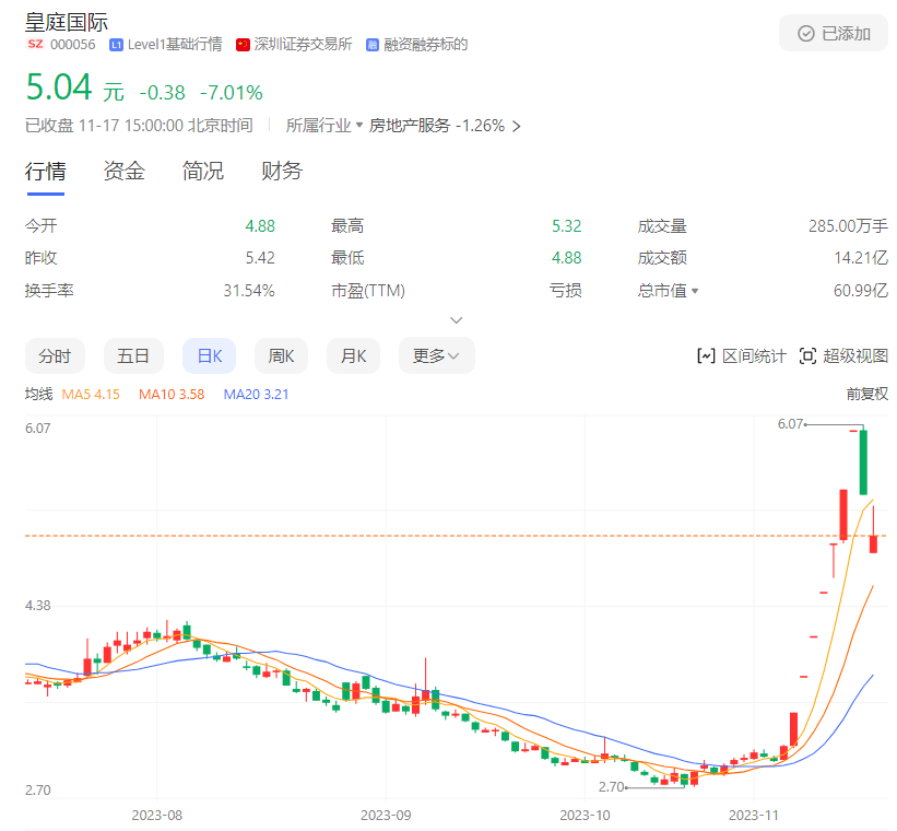 跟前几天股价连续大涨相比,皇庭国际的业绩可谓是下降的严重。从11月6日开始,皇庭国际的股价就开始拉升,到了11月7日直接涨停,此后从8日到15日几个交易日的股价都出现了涨停,收报6.02元/股。