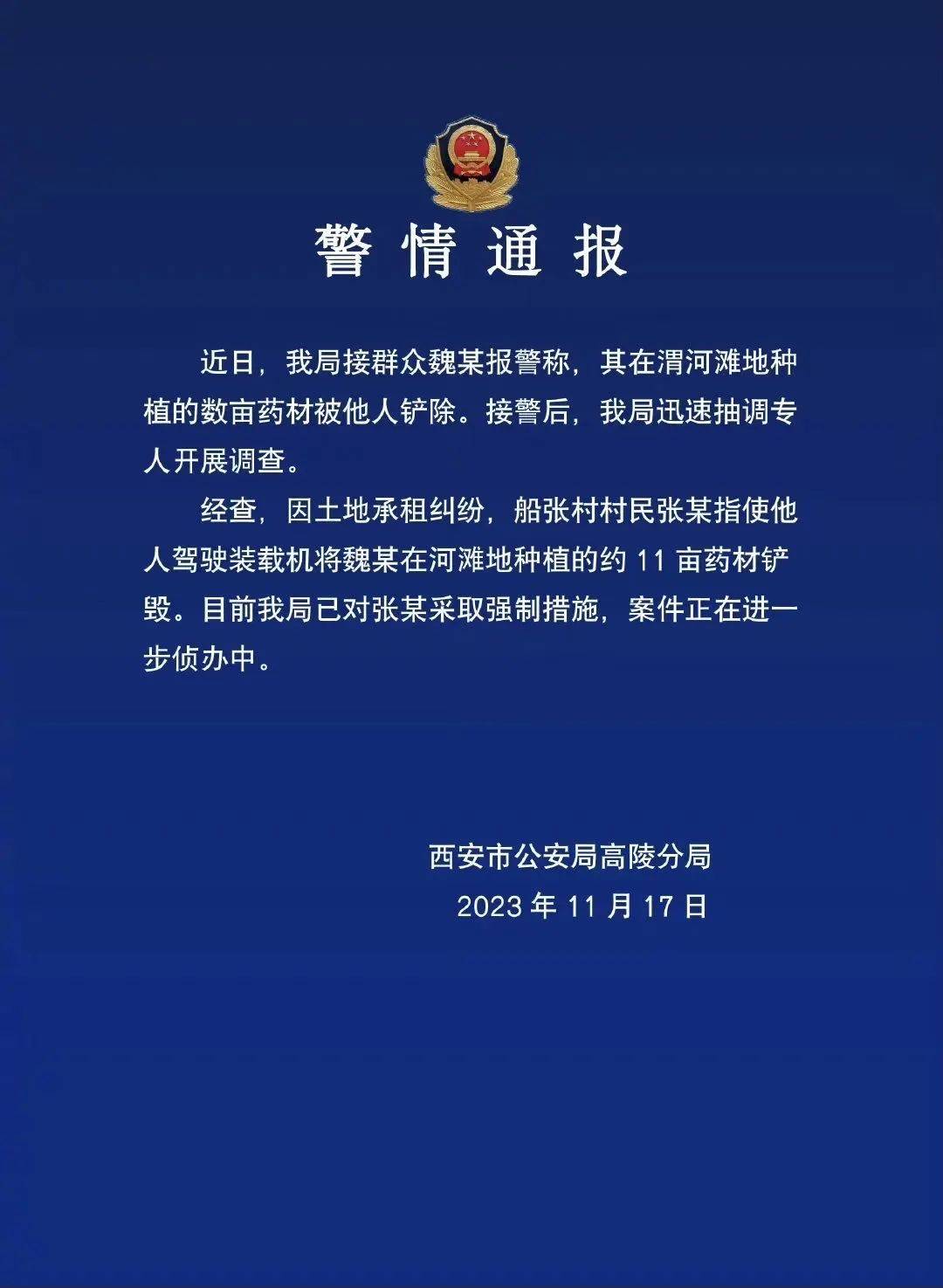 11月17日,陕西省西安市高陵公安分局发布警情通报称,因土地承租纠纷,船张村村民张某指使他人驾驶装载机将魏秦川在河滩地种植的约11亩药材铲毁。目前,警方已对张某采取强制措施,案件正在进一步侦办中。