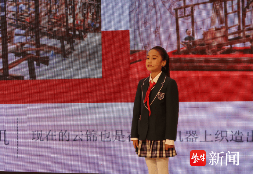 除了忆往昔峥嵘岁月,还有选手对家乡文化做了深入调查与感悟。南师附中江宁分校小学部的费敏杰从南京云锦入手,讲述南京这座城的文化创新与城市魅力。费敏杰告诉记者,第一次见到云锦时,就被云锦美丽的花纹吸引,“通过做红领巾讲解员的这个契机,我对南京云锦有了更深入的理解。云锦从古至今流传下来,集合了代代中国人的智慧结晶,令人叹为观止。能够作为讲解员去介绍、弘扬中国传统文化,是件让我特别自豪的事情。”