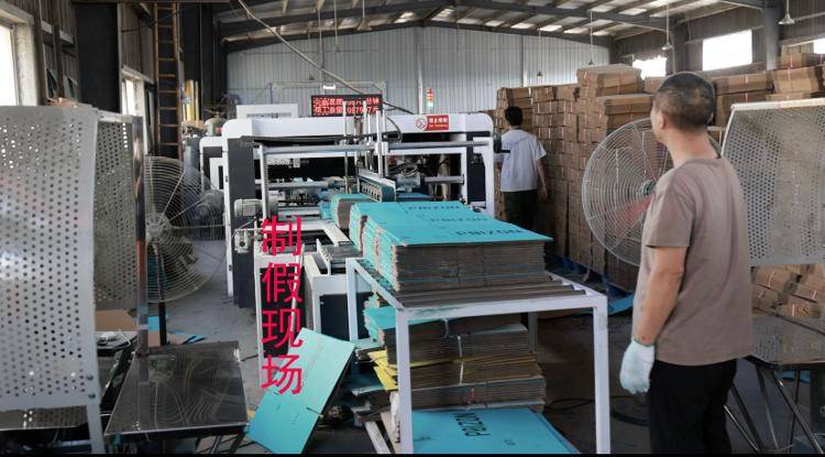 据悉,本次被捣毁的6个制假窝点,都是以违法生产仿冒“得物包装”为主要业务。三名违法工人被警方当场抓获时,工厂内还在进行“假包装”的印刷作业,约莫400平米的造假仓库,堆放着超过2万个仿冒的“得物假箱子”,调制的蓝色油墨痕渍四处可见。同一时间,另一处现场,超过10万个仿冒“得物假箱子”所在的一整层园区仓库,也被警方一举捣获。