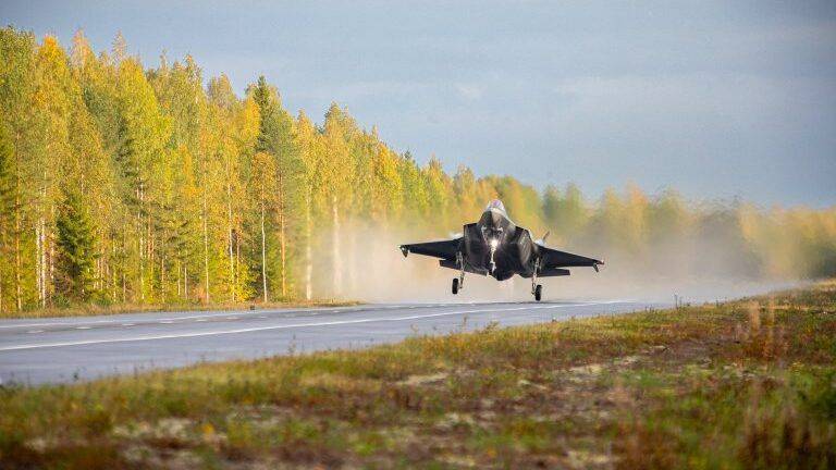 芬兰中部,挪威空军的两架F-35A隐形战机在一条公路上徐徐降落,这是这种传统起降型战机头一次成功在标准机场以外的地方着陆。