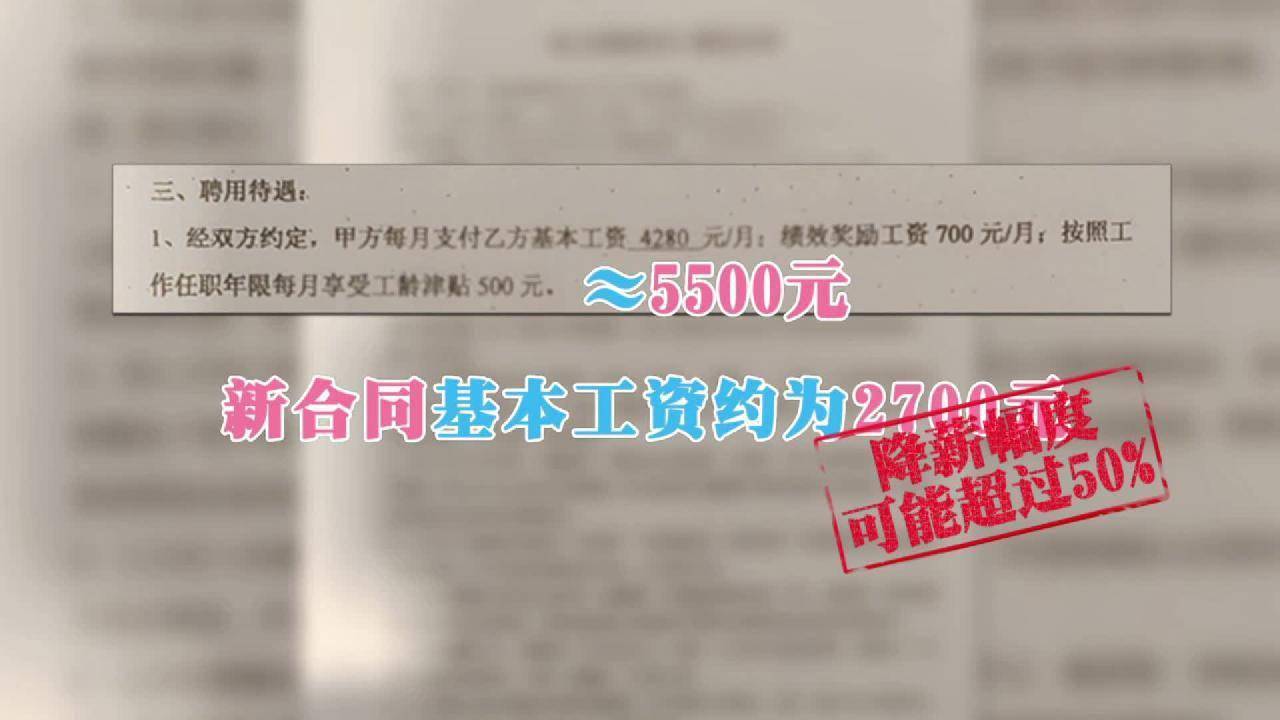 薛女士2022年签的劳动合同,约定薛女士基本工资为4280元,每月还有700元的绩效工资和工龄津贴500元,共计约5500元。如果幼儿园新合同上的基本工资仅为2700元的话,降薪幅度可能会超过50%。