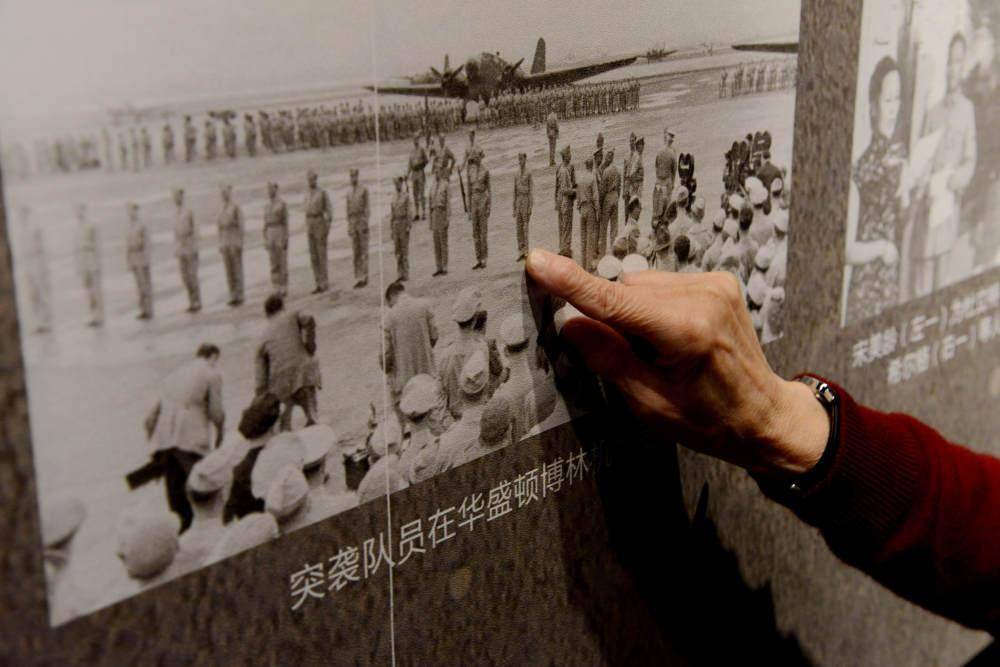杜立特突袭者子女协会成员在老照片中寻找父辈的身影。(王飞 摄)
