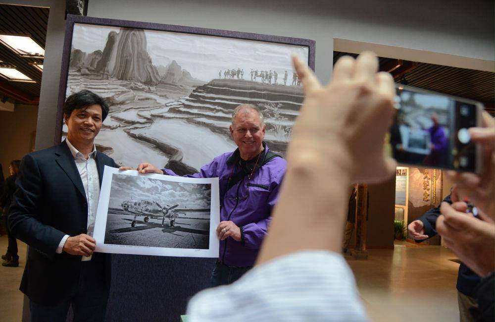 2018年10月25日,在衢州访问的美国雷德温市摄影家向纪念馆捐赠他拍摄的杜立特突袭行动同型轰炸机照片。(王飞 摄)