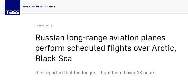 当地时间11月16日,俄罗斯国防部通报称,俄罗斯空天军远程航空部队的图-160战略轰炸机、图-22M3远程轰炸机等机型在北冰洋、北大西洋、黑海、波罗的海、太平洋的中立水域上空完成系列飞行,最长飞行时间超过了13小时。
