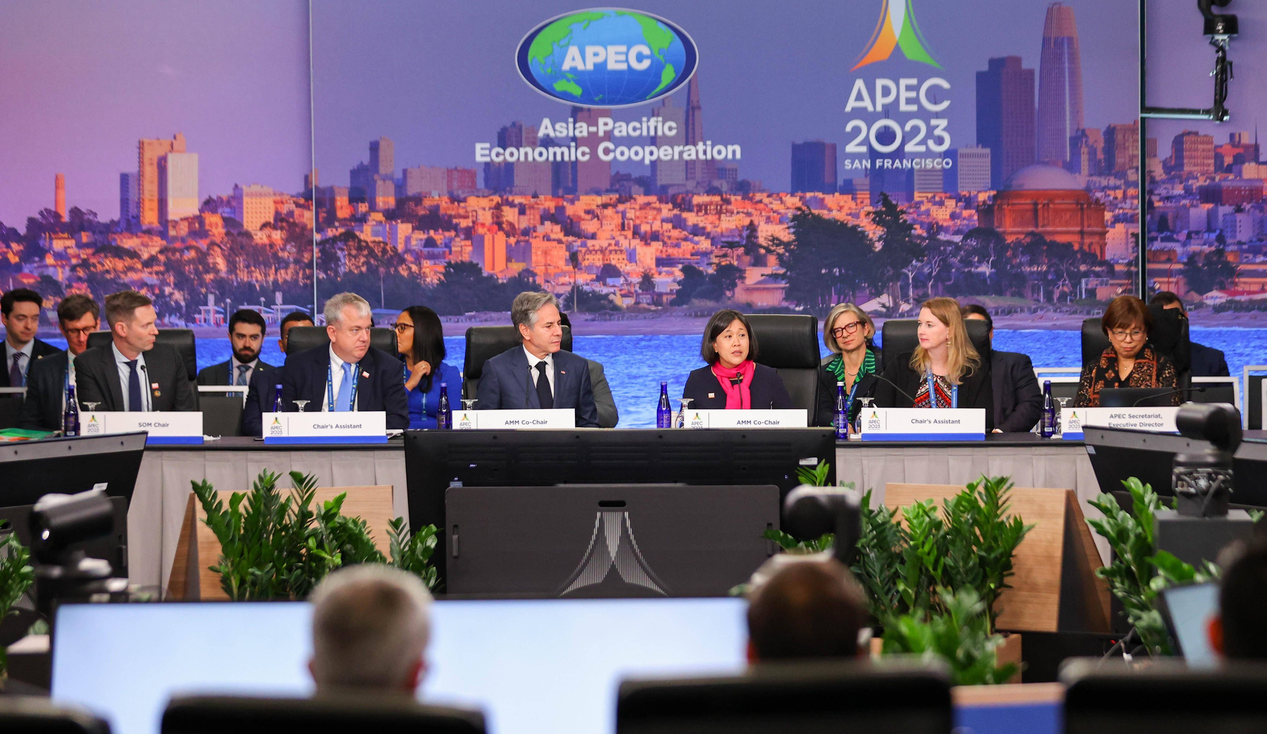 11月14日,美国国务卿布林肯(中左)和贸易代表戴琪(中右)共同主持在旧金山举行的亚太经合组织部长级会议。