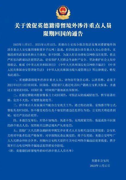 11月17日,清远英德市公安局发布通告,敦促40名英德籍仍滞留境外涉诈重点人员,必须于12月15日前回国。 通告指出,英德籍滞留境外的涉诈重点人员,切勿存有侥幸心理,认清形势,必须于2023年12月15日前回国。