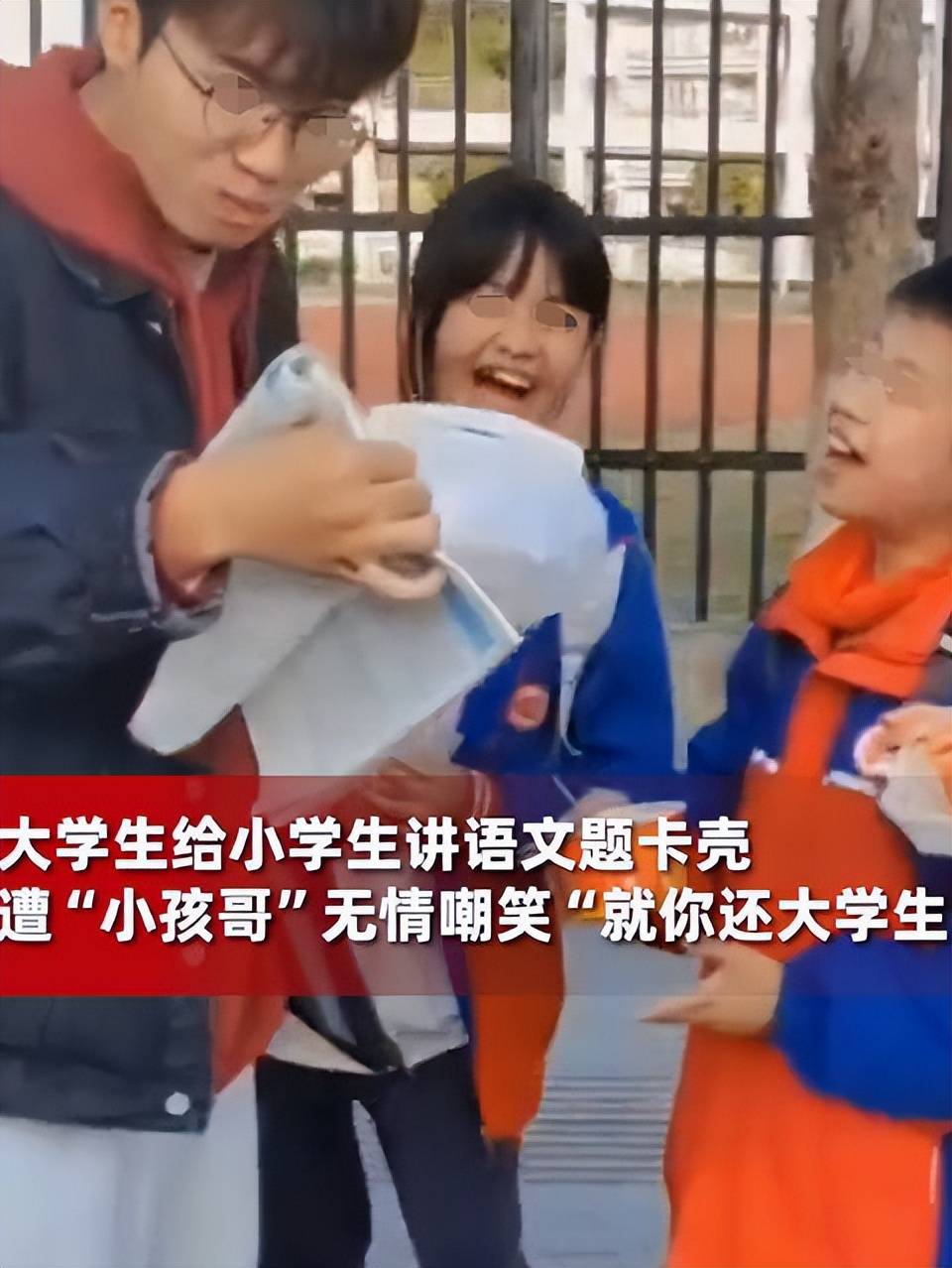 大学生拿过小学生问的题目以后,没有回答出来,结果五六个小学生中的一名男同学说道“就你还大学生呢”,然后“被无情嘲笑”。