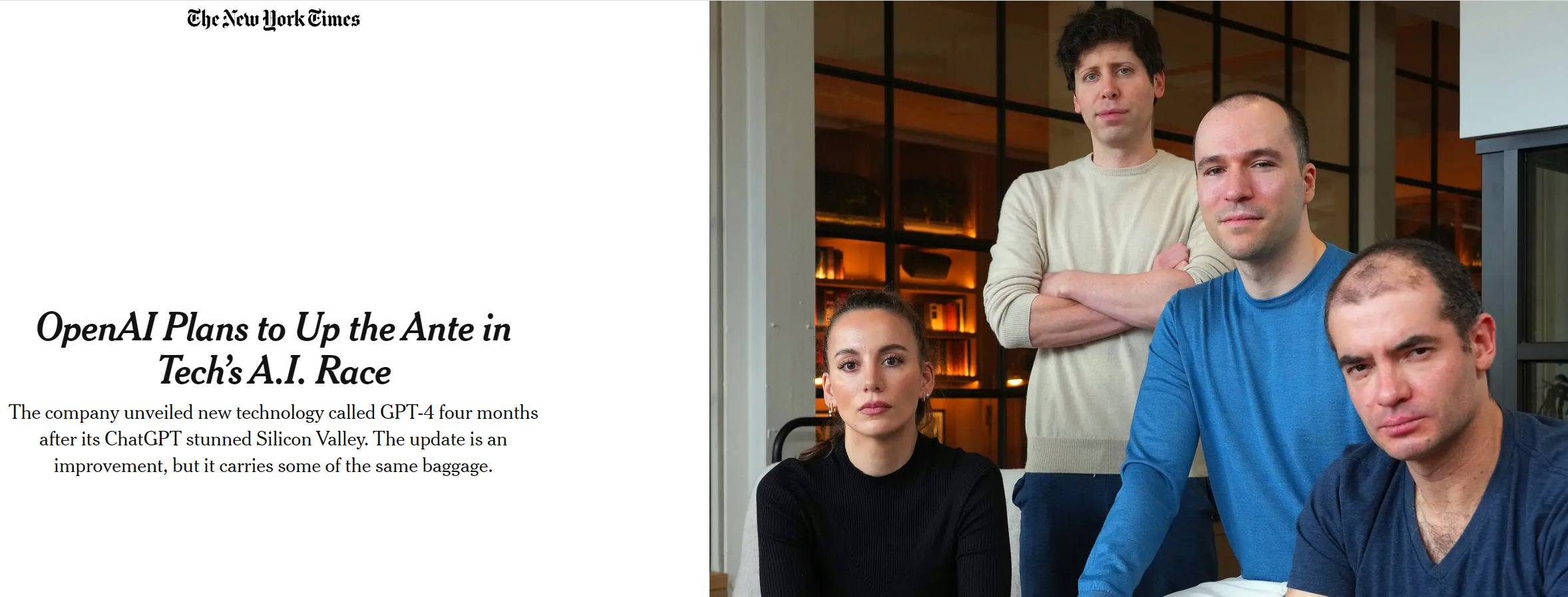 右起分别是首席科学家伊尔亚·苏茨克维(Ilya Sutskever)、总裁兼董事长格雷格·布洛克曼 (Greg Brockman)、山姆·阿尔特曼(Sam Altman)和首席技术官米拉·穆拉蒂(Mira Murati)。图片来源:《纽约时报》截图