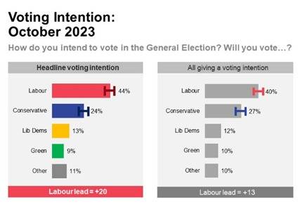 据路透社,英国政府将在2025年1月之前举行大选。然而目前,由苏纳克领导的保守党在民意调查中落后工党20多个百分点。根据调研机构Ipsos于11月9日发布的10月民调结果,英国工党的支持率为44%,而保守党则只有24%。