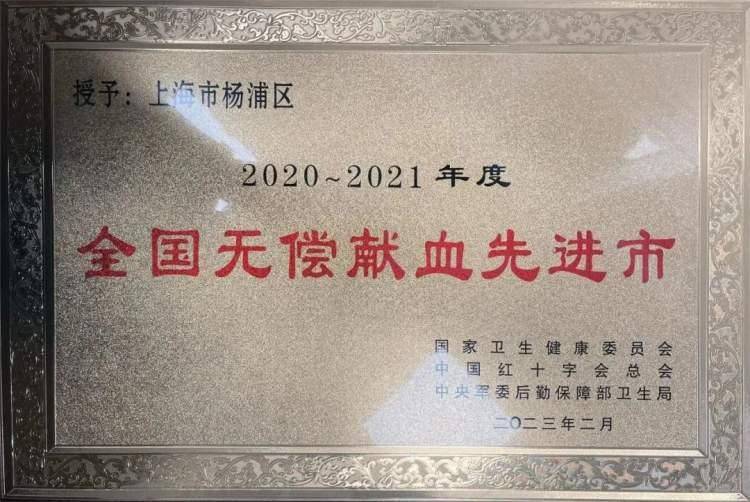 杨浦区荣获2020-2021年度全国无偿献血先进市,是社会各界共同支持、参与、努力的结果,是属于杨浦全体献血单位、献血者的荣誉。