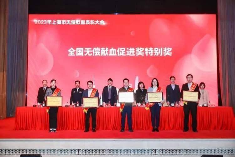 杨浦区卫生健康委员会荣获“全国无偿献血促进奖特别奖”,区卫健委副主任刘辉(前排左一)作为代表领奖