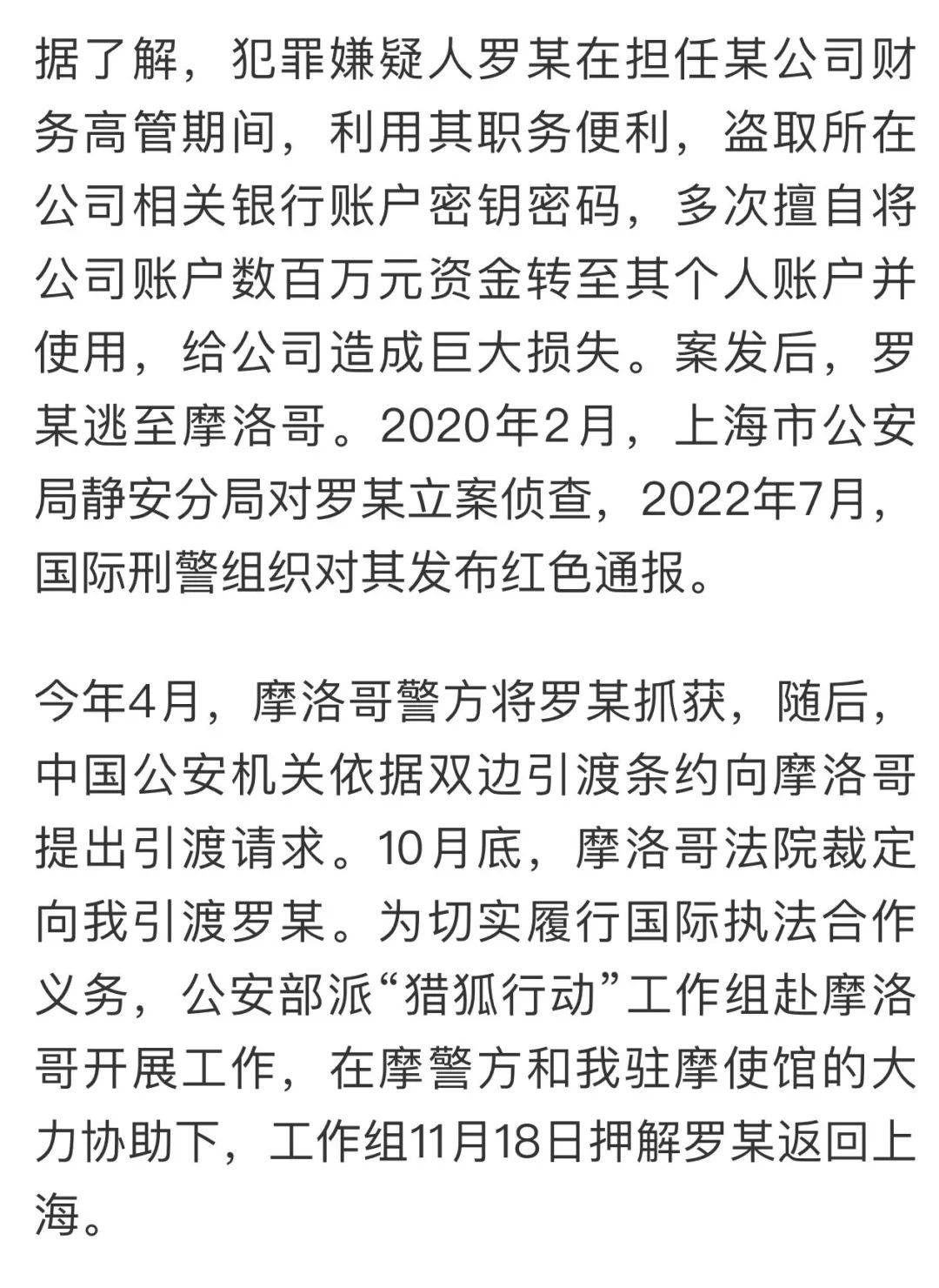 记者从公安部获悉:11月18日上午,公安部“猎狐行动”工作组将上海公安机关通缉的经济犯罪嫌疑人罗某从摩洛哥引渡回国,这是2021年中摩引渡条约生效后首例成功案例。