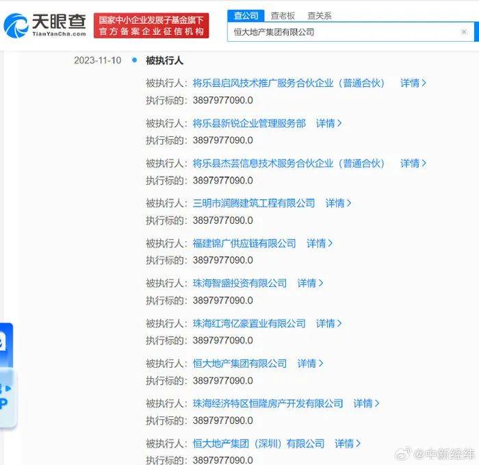 天眼查App显示,近日,恒大地产集团有限公司、三明市润腾建筑工程有限公司、珠海经济特区恒隆房产开发有限公司、恒大地产集团(深圳)有限公司、珠海智盛投资有限公司等新增一则被执行人信息,执行标的38.9亿余元,执行法院为深圳市中级人民法院。