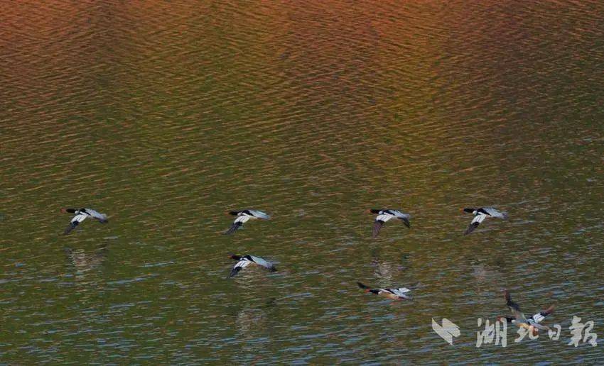 初冬时节,松滋洈水国家湿地公园植被茂密,风景如画。“鸟中大熊猫”中华秋沙鸭如期而至。