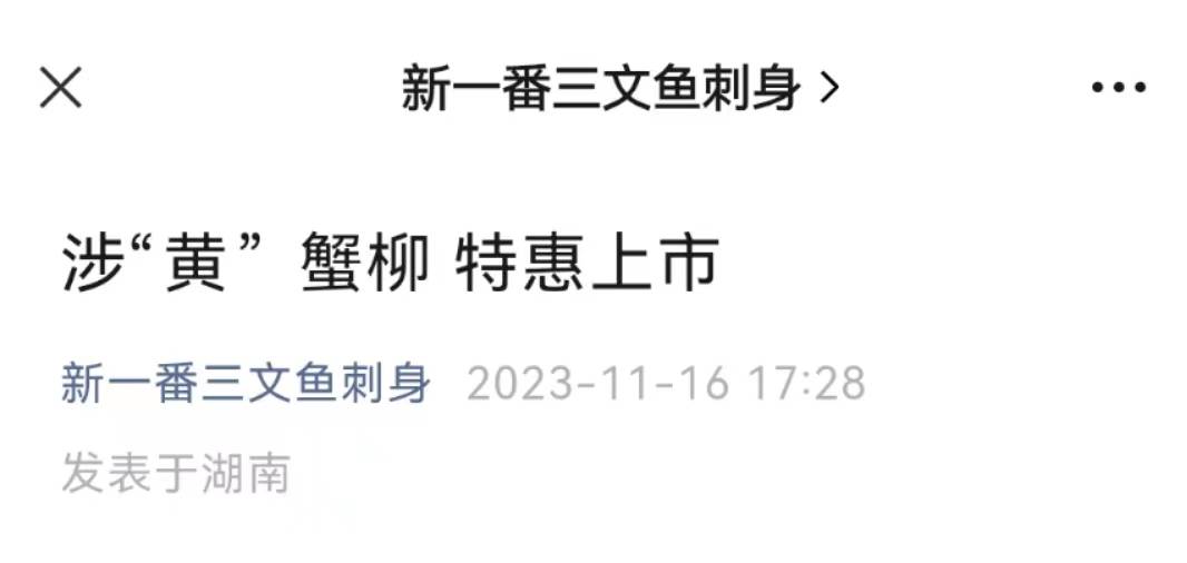 11月16日下午5点28分,新一番三文鱼刺身在公众号发表了一篇标题为“涉‘黄’蟹柳特惠上市”的广告推文,该文章引发了网友的关注,不少市民向晨意帮忙记者与监管部门举报此事,长沙市市监部门介入调查,并指出该广告涉嫌两项违法行为。