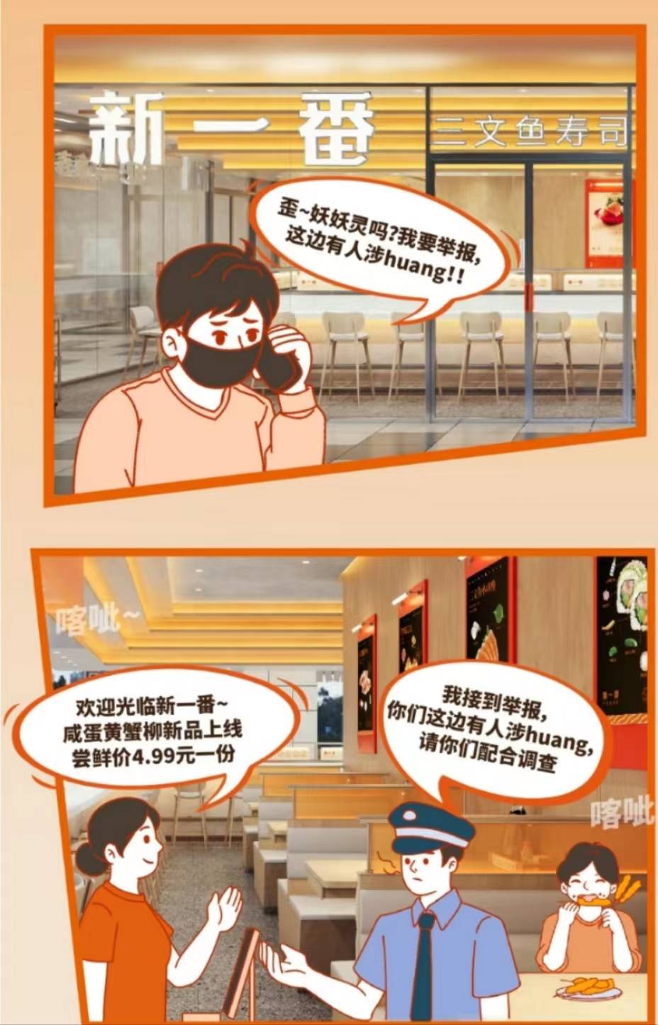 11月17日,长沙多名消费者向晨意帮忙记者报料称, 新一番三文鱼刺身的公众号推送了一篇“涉黄”推文。晨意帮忙记者发现,该推文发表于11月16日下午5点28分,标题为“涉‘黄’蟹柳特惠上市”。在正文部分的漫画里,还出现了疑似警察的卡通形象。该条推文的IP地址显示为湖南。