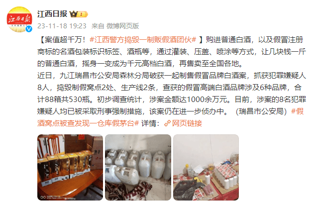 近日,九江瑞昌市公安局森林分局破获一起制售假冒品牌白酒案,抓获犯罪嫌疑人8人,捣毁制假窝点2处、生产线2条,查获的假冒高端白酒品牌涉及6种品牌,合计88箱共530瓶。初步调查统计,涉案金额达1000余万元。目前,涉案的8名犯罪嫌疑人均已被采取刑事强制措施,该案仍在进一步侦办中。(瑞昌市公安局)