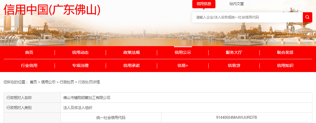 近日,信用中国(广东佛山)网站发布一条处罚信息,涉及佛山市镱勋铝窗加工有限公司,该公司生产不符合保障人体健康和人身、财产安全标准和要求的产品。具体信息如下: