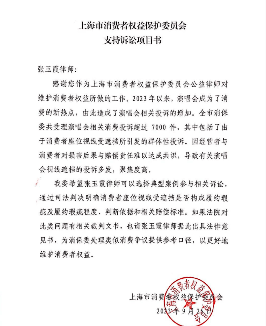 在支持诉讼项目书中,上海市消保委指出,2023年以来,演唱会成为了消费的新热点,由此造成了演唱会相关投诉的增加。上海市消保委共受理演唱会相关消费投诉超过7000件,其中包括了由于消费者座位视线受遮挡所引发的群体性投诉。因经营者与消费者对损害后果与赔偿责任难以达成共识,导致有关演唱会视线遮挡的投诉多发,聚集度高。